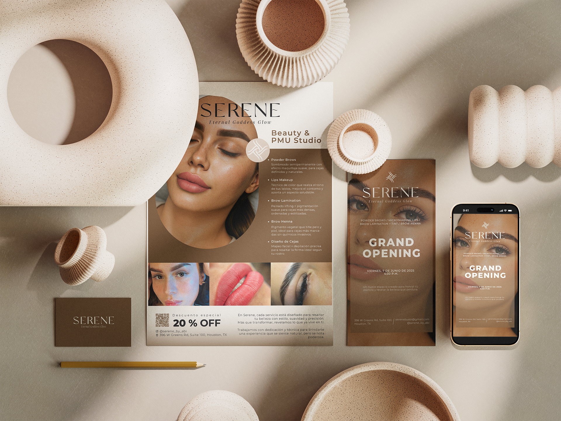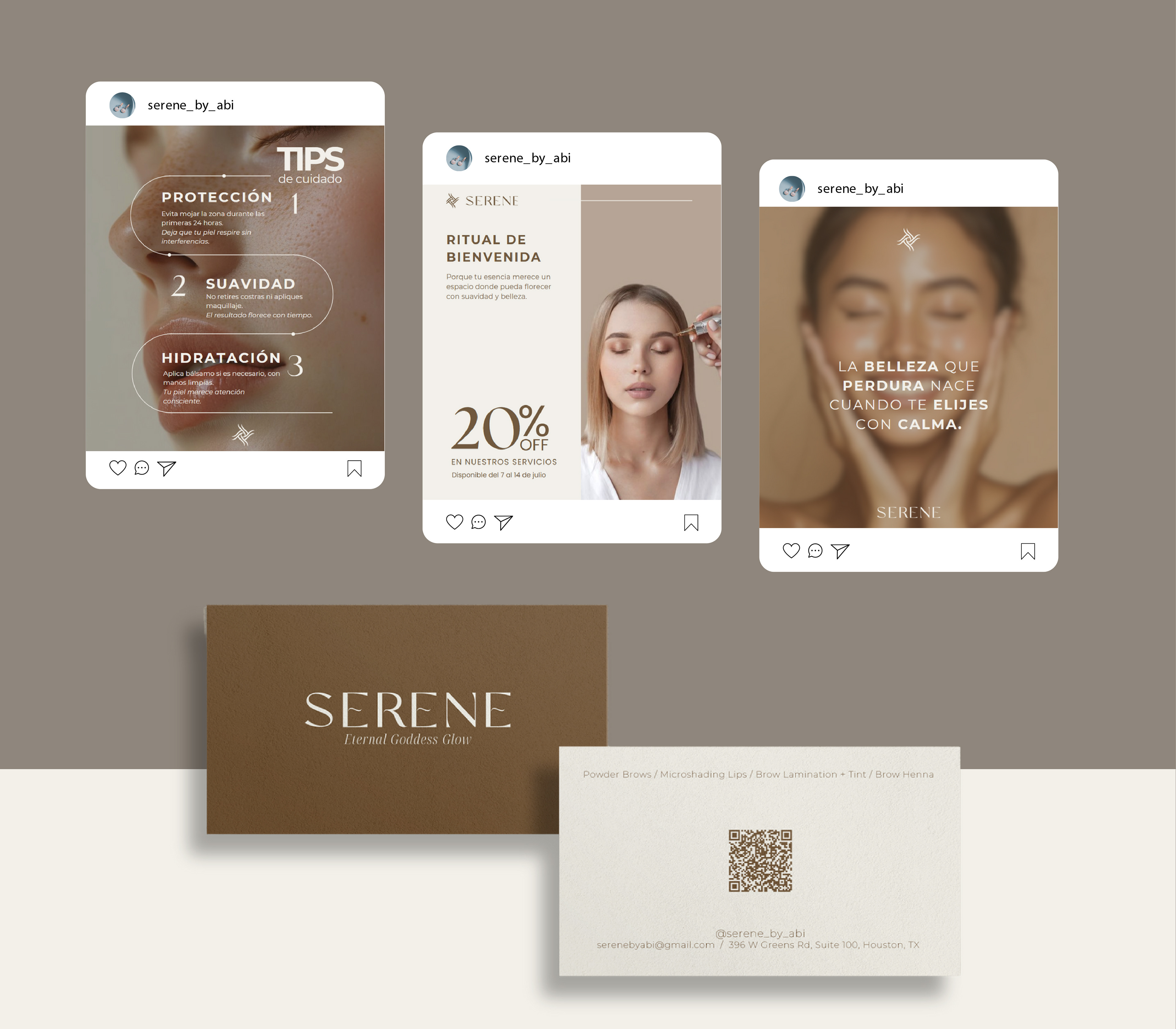 Serene by Abi es un estudio de estética facial especializado en micropigmentación, diseño de cejas y tratamientos de realce natural, ubicado en Houston, TX. Abigail me contactó previo a la apertura de su espacio físico con el objetivo de construir una identidad clara, coherente y profesional que acompañara el crecimiento de su marca desde el inicio. Desarrollamos un sistema de branding integral que traduce técnica, armonía y sofisticación en cada punto de contacto, asegurando una experiencia visual alineada con la esencia del estudio.